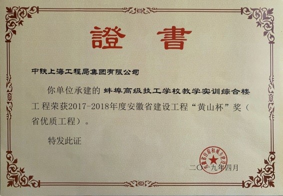 公司承建的蚌埠高級技工學校教學實訓綜合樓工程榮獲2017-2018年度安徽省建設工程“黃山杯”獎(省級優質工程)。...