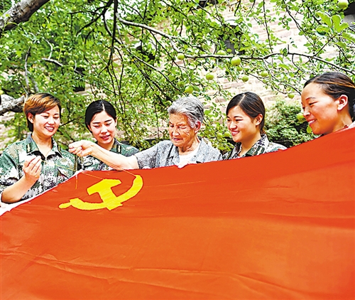 6月30日,中國歷史文化名村河北省沙河市王硇村開展“同心共筑中國夢 紅色基因永傳承”主題活動(dòng),一位60年黨齡的老黨員帶領(lǐng)女子民兵班的民兵,一針一線將中國共產(chǎn)黨黨徽繡在鮮艷的紅旗上,以表達(dá)對(duì)黨的無限熱愛、對(duì)祖國的美好祝福。趙永輝攝